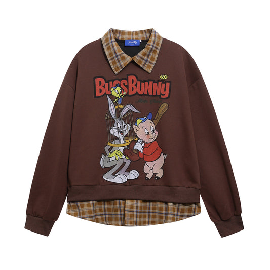 Retro Fun Cartoon Print Spliced Mock Two-Piece Polo Neck Sweatshirt Unisex Casual Top